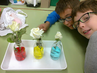 Luego hemos introducido unas flores blancas en los botes y hemos podido comprobar con el paso de los días, que empiezan a aparecer motitas del color del agua del bote, en los pétalos de las flores blancas.